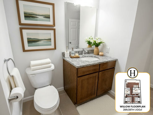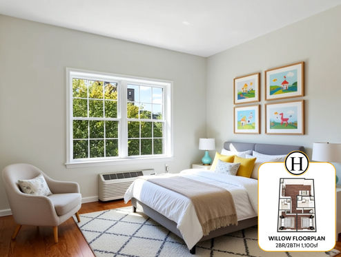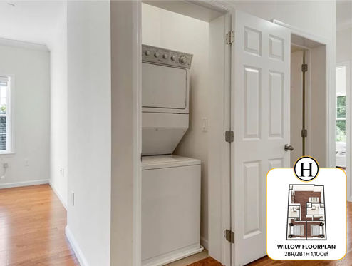 Unit 320, the Willow floor plan at The Hammel II offers 1,100 square feet of thoughtfully designed living space with 2 spacious bedrooms, 2 full bathrooms, and an in-unit washer and dryer for added convenience.