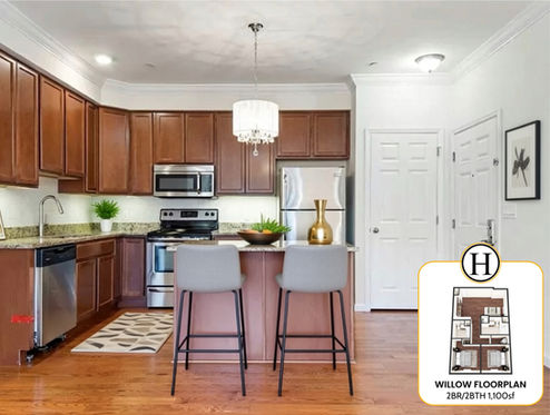 Unit 320, the Willow floor plan at The Hammel II offers 1,100 square feet of thoughtfully designed living space with 2 spacious bedrooms, 2 full bathrooms, and an in-unit washer and dryer for added convenience.